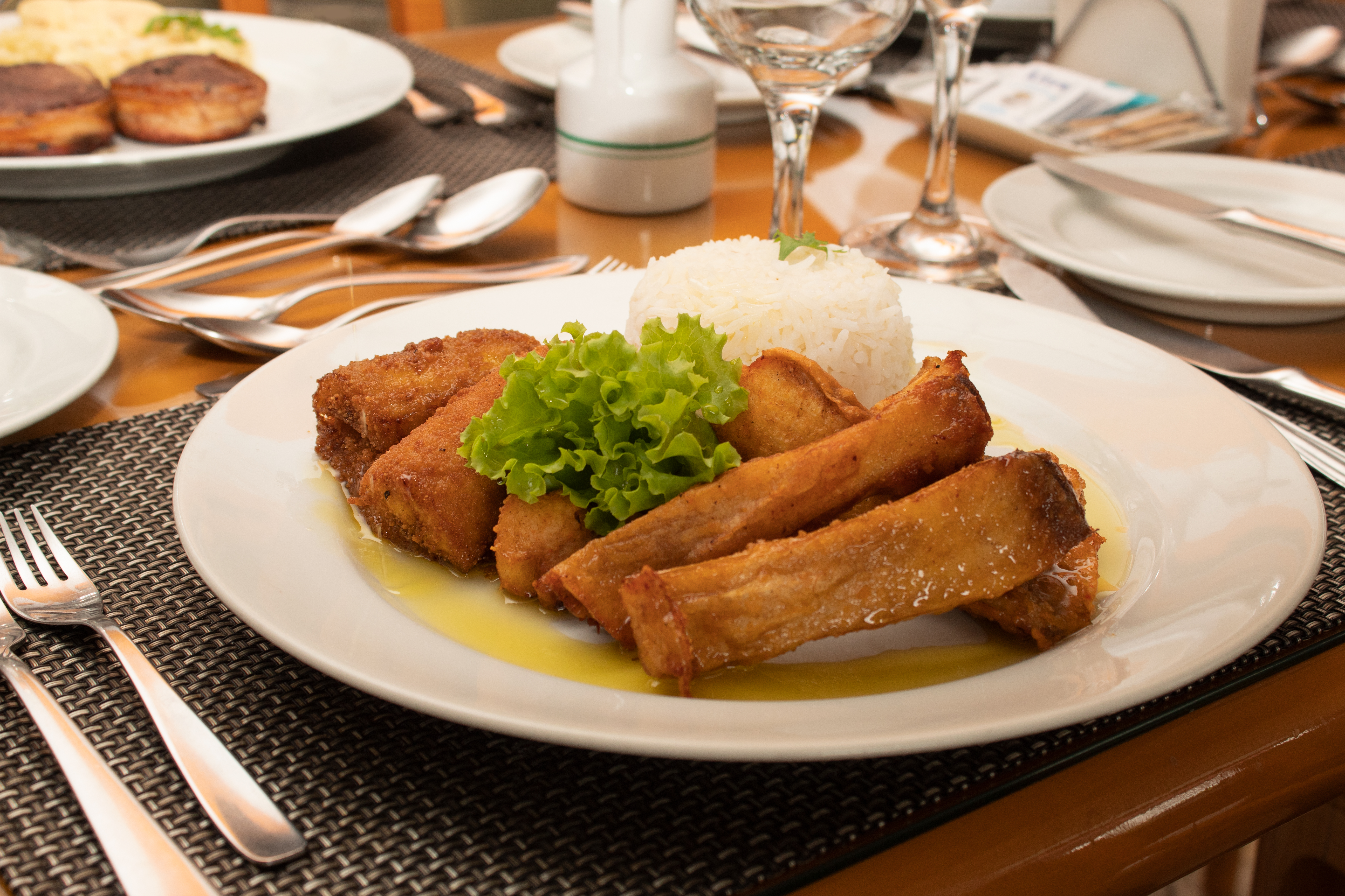| (Fried tambaqui ribs) (Costela Frita: Servida com Arroz, Farofa e Banana) |