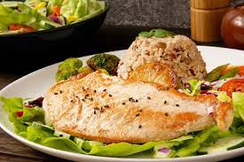 | Peito de frango grelhado acompanhado de arroz e Legumes salteados na manteiga. |